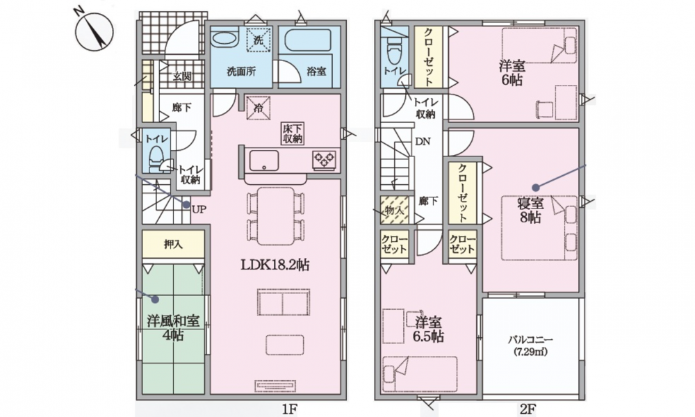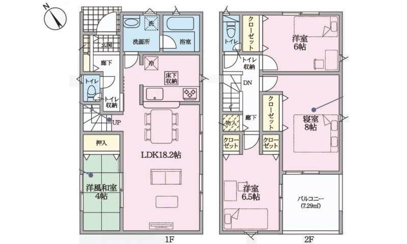 - システムキッチン、カウンターキッチン、シャンプードレッサー、洗浄便座、浴室乾燥機、追い焚き、複層ガラス、ウォークインクローゼット、モニタ付インターホン、駐車場2台分、床下収納、トイレ2箇所、対面式キッチン